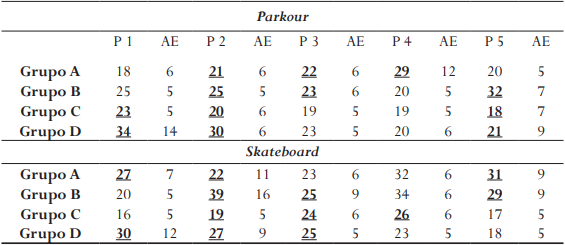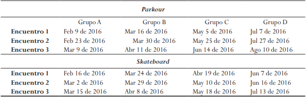 En el trabajo de campo se realizaron cuatro entrevistas grupales de discusión por cada práctica -4 grupos de parkour y 4 de skate-, dichas entrevistas se constituyen de tres encuentros para cada una (tabla 1). Los grupos los constituyeron cinco practicantes, que, a partir de su importancia y liderazgo, fueron elegidos por votación entre sus miembros. Lo anterior corresponde a 24 sesiones de trabajo con un promedio de 40 minutos de grabación para cada sesión, esto representa 960 minutos de registro.