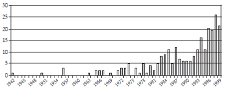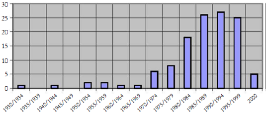 Al-Allam precisa que en el listado aparecen obras que técnicamente son autobiografías. Es éste un tema sensible en la crítica literaria marroquí. Textos narrativos que bordean los límites ficcionales y que podrían incluirse en el espacio autobiográfico como novelas autobiográficas o autobiografías noveladas, siempre de límites difusos y permeables, aparecen en diferentes épocas y contextos.46 Piénsese en textos como al-Zāwiya (1942), Fi-l-ṭufūla (1956) o al-Ḫubz al-ḥāfī (El pan desnudo, 1982). Al-Allam no es el único: en la clásica bibliografía de Mustafà Yaalà, ya mencionada, la inclusión de textos autobiográficos es normal. Ambas bibliografías no coinciden en las obras recogidas. Por ejemplo, en el listado de Yaalà de 1984 y en otro del mismo autor de 200247 se recogen nada menos que 17 novelas aparecidas de manera seriada en la prensa entre 1944 y 1955 y que al-Allam omite, por ejemplo Tāhā (1941), de Ahmad al-Ḥasan al-Sakūrī; o al-Rūmiyya al-Šaqrā’ (La cristiana rubia, 1949), de ‘Abd al-‘Azīz bn ‘Abdallāh, etcétera. He optado por situar el umbral inicial del arco temporal abarcado en el año 1930, con al-Rihla al-Marrākušiyya, de Muhammad bn ‘Abdallāh al-Mu’aqqit, como hace Yaalà. Las 249 novelas recogidas en la bibliografía de al-Allam entre 1942 y 1999 se distribuyen como se observa en la gráfica 1.