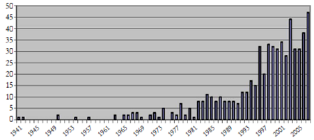 Según al-Allam, hasta el año 1976, es decir, “treinta años después de la aparición del primer texto”, la producción es irregular, con años en blanco.48 Los vacíos son numerosos: de 1943 a 1949, de 1951 a 1955, de 1957 a 1962, 1964, 1968, 1970 y 1975. Hasta el año 1982 no se alcanza un mínimo de cinco novelas anuales. Finalmente, se observa un asentamiento a partir de la mitad de los años noventa del siglo pasado. La continuidad de este incremento se observa en listados que abarcan fechas posteriores, como el de Muhammad Yahyá Qāsimī (gráfica 2), donde desde 1941 hasta 1999 -es decir, en 59 años- lista 309 novelas, cifra que posteriormente casi se alcanza, con otras 284 novelas, en el periodo mucho más breve que media entre 2000 y 2007.49