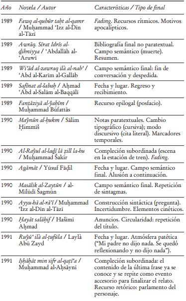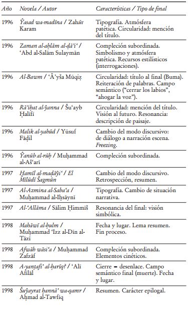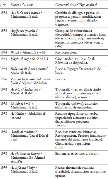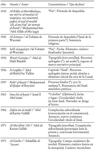 El íncipit ha merecido cierto interés en la reflexión sobre la novela árabe,24 pero el cierre lo ha sido en menos ocasiones. Sabry Hafez (Ṣabry Ḥāfiz) aborda la cuestión en el marco de sus observaciones a la novela Ḥadīṯ al-Qaryah, en su conocido estudio The Genesis of Arabic Narrative Discourse, en cuyo último epígrafe, “The Open Ending and Its Significance”, concluye que los finales “son normalmente divididos en finales cerrados y abiertos”, y los primeros se anuncian con la repetición “de algunos elementos previos de forma diferente, o por medio de mecanismos de cierre tales como la marcha del personaje de la escena de la historia, o el cierre de puertas, ventanas, o incluso de vidas, por medio de la muerte”.25