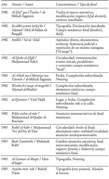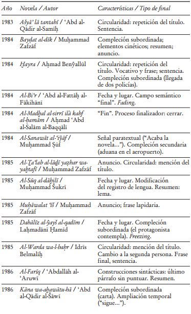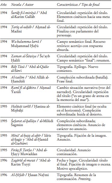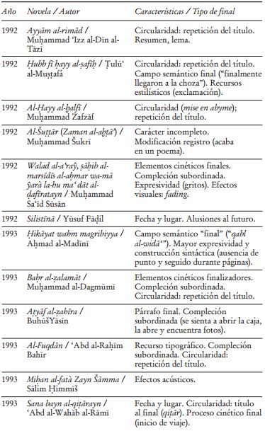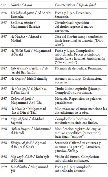 La limitada producción novelística en Marruecos hasta los años noventa facilita la obtención de datos más globales y un mejor ajuste del panorama del género. El examen que aquí se presenta estudia datos parciales en serie, buscando estructuras y tendencias en el desarrollo de un fenómeno cultural en una zona geográfica concreta -Marruecos, en este caso-. No se trata, en términos relativos, de un gran volumen de datos, pero sí del examen del cierre de un número significativo de novelas escritas en árabe en Marruecos hasta el año 2000, lo que permite observar el surgimiento y el desarrollo de ciertos rasgos formales de los que se pueden derivar consecuencias, quizá ya conocidas o intuidas. Por ejemplo, la vinculación de finales especulares, o del cambio de registro con la inserción de poemas, con las tendencias de novela experimental que aparecieron con fuerza en Marruecos entre los años setenta y ochenta.43