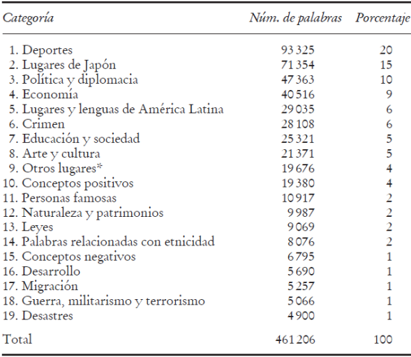 La frecuencia de la publicación de temas específicos fue la base de la codificación de la extensa lista de titulares. En una primera clasificación surgieron 46 categorías que se fueron combinando hasta llegar a 19. La reagrupación forma parte del método, ya que ayuda a comprender los temas tratados en amplias cantidades de información y, en este caso particular, el significado de América Latina en Japón. Es decir, se usó básicamente un método cuantitativo que incluye fenómenos simbólicos (Krippendorff, 2004). Sin embargo, para enriquecer aún más el estudio de los contenidos y explicar algunos de los resultados de la codificación en detalle, se recurrió al análisis textual, que es más interpretativo. Las categorías del análisis de contenido fueron el punto de partida para la selección de artículos.
