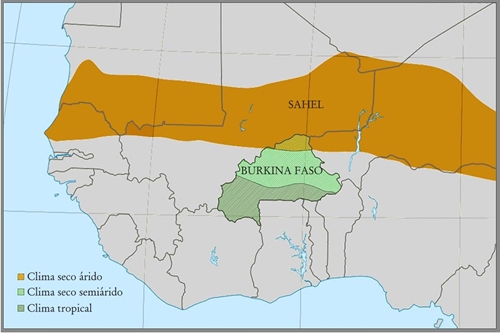 El Sahel se encuentra situado al sur del desierto del Sahara y constituye una zona de transición tanto geográfica como climática que afecta el tipo de vegetación y los recursos naturales disponibles. Esta franja ocupa parcialmente el norte de Burkina Faso, un país en el que convergen dos tipos principales de clima que condicionan de forma muy diferente el modo de habitar y las tipologías arquitectónicas: cálido y húmedo en la zona sur, y cálido y seco en el área central y norte (mapa 1) (Kottek et al. 2006, 261).
