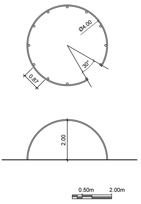 El primer paso es marcar la dimensión deseada del módulo circular sobre el lugar seleccionado. Se desbroza el terreno y se delinea un círculo perfecto. Se marca la ubicación de la madera estructural y la entrada principal. A continuación, se levanta la estructura con ramas de longitud, grosor y edad adecuados, que luego se introducen en el suelo unos 30 cm. Dichas ramas estructurales se disponen con una separación constante, igual al ancho de una puerta, para asegurar la estabilidad de la estructura en los 360º (imagen 3).