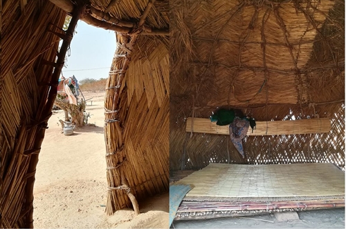 En algunos casos, las cubiertas se realizan con hojas, o bien con paja o cañas13 sobre ramaje o listones de madera del campo atadas con cordeles de fibras vegetales. Para el suelo de la vivienda se utiliza la misma tierra del lugar, lo cual es una de las razones por las que es tan importante elegir bien la ubicación y preparar la zona antes de la puesta en obra. El interior a veces se decora con secco, nattes,14 tejidos o adornos, aunque generalmente el ornamento es superfluo en estas construcciones, cuyo carácter práctico y temporal se hace completamente evidente.