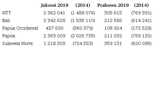 La campaña demostró ser más polarizante en términos políticos que la de 2014. Los datos sobre las elecciones que proporcionó la Komisi Pemilihan Umum (KPU, Comisión Electoral General) demuestran que en las regiones islámicas más conservadoras, como Java Occidental, Sumatra Occidental, Sulawesi Sur y Aceh, Prabowo obtuvo más votos.7 En las más liberales o con tendencia pluralista, como Java Oriental (que es predominantemente musulmana, pero tiene una fuerte tradición liberal), Jokowi obtuvo más votos y aumentó sus márgenes. En las cinco provincias que no tienen mayorías musulmanas, los resultados fueron asombrosos. El apoyo a Jokowi aumentó de manera significativa (véase cuadro 1).