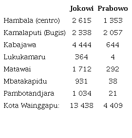 En Sumba Oriental, Jokowi obtuvo 92% de los votos. El poco apoyo que obtuvo Prabowo provino principalmente de Waingapu, la capital de la kabupaten, donde hay una población musulmana más nutrida. Esto se corrobora si se tienen en cuenta los resultados de Waingapu por kelurahan (subdistrito). Una base importante de apoyo para Prabowo (pero nunca mayoritario) procedió de los dos subdistritos con grandes poblaciones musulmanas: Hambala, en el área central, donde hay tres mezquitas, y Kamalaputi, cerca del puerto de Waingapu y hogar de Kampung Bugis, donde habitan bugineses étnicos y musulmanes religiosos (véase cuadro 2). La promesa que hizo Jokowi de visitar Sumba unos meses más adelante también ayudó a su campaña. Sin embargo, Soekarno sigue siendo el único presidente indonesio en haber visitado la isla, pues Jokowi no acudió, sino que envió en su lugar al ministro de Comunicación e Información, Johnny G. Plate, un católico originario de Flores.