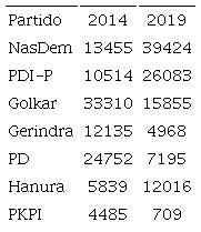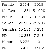 Sin embargo, el mayor efecto de las deserciones se notó en el legislativo nacional (DPR-RI, Consejo Representativo Popular-República de Indonesia). En ese ámbito, donde el estatus y los contactos de los candidatos individuales con la región no son tan importantes, NasDem obtuvo de nuevo casi el triple de votos, y el PDI-P, más del doble, mientras que Golkar ganó menos de la mitad (véase cuadro 4). Otros partidos marginales también tuvieron pérdidas significativas (Gerindra, PD, Hanura, PKPI).