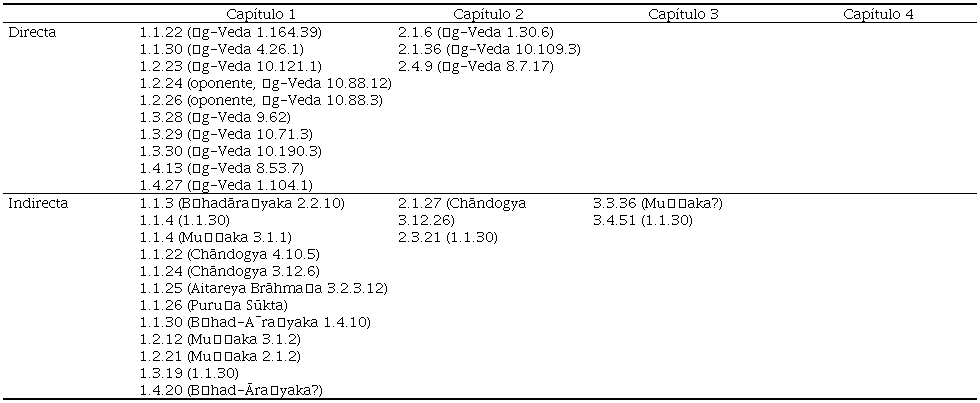En el cuadro 1 se observa que la mayor parte de las referencias al Ṛg-Veda se concentra en los comentarios al capítulo 1 (Samanvaya) de los Brahma-Sūtra, en tanto que hay una ausencia notable de éstas en el capítulo 4 (Phala). Además, hay un decremento gradual a partir del capítulo 1, donde se concentra la mayor parte de las citas directas e indirectas, para decaer en el capítulo 2 (Avirodha), mientras que en el capítulo 3 (Sādhana) sólo hay citas indirectas. Este último tipo consiste principalmente en citas de segunda mano del Ṛg-Veda a través de pasajes, en general de las upaniṣad, que funcionan como pasajes prototipo y pasajes vínculo. Como una primera aproximación, es plausible que haya más citas del Ṛg-Veda en el capítulo 1 como mera extensión del empleo de las fuentes canónicas, puesto que aquí es donde se argumentan la unidad y la armonía del conocimiento de brahman con base en las escrituras.