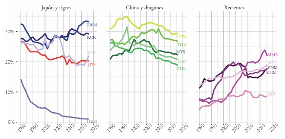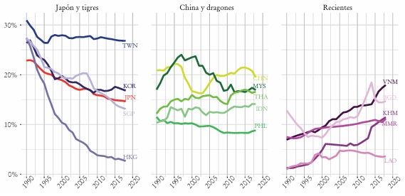 Debido a la mencionada “orientación exportadora” de los procesos de desarrollo de la región, este mismo indicador representa una buena imagen de las oleadas de los países que la conforman. En la década de 1960, Japón concentró 5% de las exportaciones mundiales de manufacturas, lo cual equivale a más de la mitad de las exportaciones de los países de la muestra. Su participación alcanzó el valor máximo de 13% en 1986. A partir de allí comenzó a perder participación y fue el único país de la región donde se observó una brusca reducción, para ubicarse en un valor de 4.6% (2019). La participación de los tigres (Corea del Sur, Taiwán, Hong Kong y Singapur) comenzó a crecer en la década de 1970 -con mayor rapidez desde 1975- y alcanzó su punto máximo en el año 2000, con un valor de 9.5% de las exportaciones mundiales, y se mantuvo relativamente estable a partir de allí. Por su parte, la participación de los dragones (Malasia, Filipinas, Tailandia e Indonesia) comenzó a expandirse hacia finales de la década de 1980, cuando se ubicaba en torno a 2%, para alcanzar su pico máximo de 4.6% recientemente.
