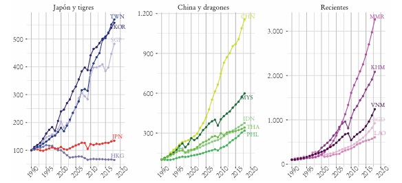 La selección de países intenta reflejar las oleadas de industrialización de la región. Un primer grupo está constituido por los tradicionalmente trabajados en la literatura de los gansos voladores: Japón y los tigres (Corea del Sur, Taiwán, Hong Kong y Singapur). Luego, la segunda oleada implicó la incorporación de los dragones (Filipinas, Indonesia, Malasia y Tailandia) y de China. Por último, los que denominamos recientes (Bangladesh, Camboya, Laos, Myanmar y Vietnam) son los que han evidenciado incipientemente un proceso de desarrollo industrial en el siglo XXI.7
