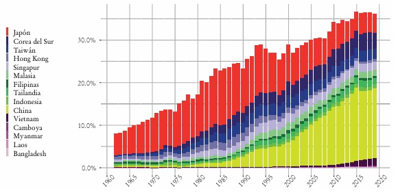 La contracara ha sido la trayectoria de la región Asia Pacífico, donde un grupo de países atravesó, desde mediados del siglo XX, un proceso de industrialización basado en la producción para el mercado mundial (Ariff y Hill 1985; Birdsall et al. 1993; Balassa 1982; Fransman 1984; Linnemann, Van Dijck y Verbruggen 1987). Esta transformación regional ocurrió en una secuencia temporal popularizada mediante la analogía de los “gansos voladores” (flying geese) (Akamatsu 1962), según la cual esos procesos comenzaron con la producción de mercancías simples (indumentaria, calzado, juguetes, etc.) y continuaron con otras más complejas a medida que las primeras, debido el incremento salarial, fueron relocalizadas en otros países de la zona que, de esa forma, se incorporaron al desarrollo (Kojima 2000; Kasahara 2013). Ahora bien, a partir del ascenso vertiginoso de China en la década de 1990, algunas de esas economías -como Japón y Hong Kong- mostraron una incipiente desindustrialización.