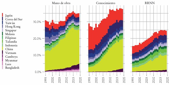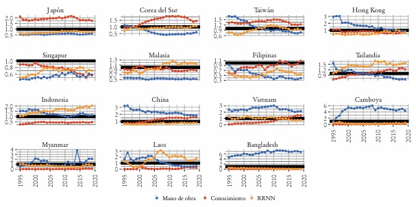 En lo que se refiere a las ramas más complejas (las intensivas en conocimiento), la participación entre los grupos se encuentra más repartida, ya que Japón y los tigres siguen ocupando lugares de relevancia, a pesar de su reducción entre 1995 y 2019 (concentrada en Japón y Hong Kong). Habida cuenta de esto, es el incremento en la participación china desde comienzos de 2000 lo que explica el mayor peso regional en este tipo de exportaciones, a lo que también aportó, aunque en mucha menor medida, Vietnam desde 2010. En este tipo de producciones el proceso de los gansos voladores parece más acotado, ya que el ingreso de China, que no sólo crece a costa de los tigres y Japón, también ha operado como barrera de ingreso tanto ante los dragones como ante los recientes.
