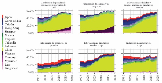 En resumen, lo primero que destaca es que la región muestra un aumento de la participación en las exportaciones mundiales de todas las categorías analizadas al tomar entre puntas el periodo analizado. Al estudiar separadamente los grupos de países, vemos que Japón y los tigres profundizaron la pérdida de relevancia en las exportaciones de productos de las ramas intensivas en mano de obra, y dieron paso a China y, en menor medida, a los recientes. Ahora bien, desde 2015 se observa cierta estabilización en Japón, entre los tigres y en China, por lo que la dinámica a futuro parece tener, sobre todo, a Bangladesh y Vietnam como protagonistas de la expansión regional, debido al estable y reducido peso de los dragones. De esta manera, parece seguir vigente el proceso descrito por los gansos voladores de deslocalización en las ramas intensivas en mano de obra entre los países de la región, aunque la magnitud de China ralentiza parte del movimiento y concentra todavía buen número de las exportaciones.