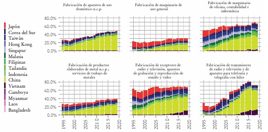 Así pues, la tendencia regional tras el despegue de China en la década de 2000 ha tenido un comportamiento distinto en cada grupo de ramas. Mientras en las intensivas en mano de obra el crecimiento de China implicó un aumento de la relevancia regional y una reducción en la participación de los países precursores, en las intensivas en conocimiento impulsó una expansión de la región en su conjunto.