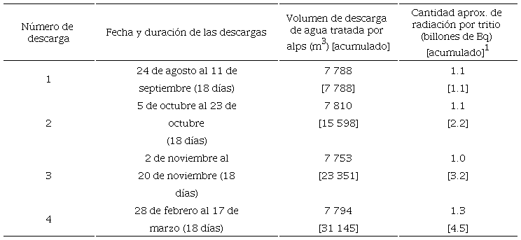 Para disminuir el flujo de agua hacia las zonas donde se contamina y evitar, en la mayor medida posible, que el agua contaminada fluya o se filtre hacia el exterior, se han realizado obras de captación y contención (pozos, by-passes, muros de contención, etc.) (Aoyama 2015). A pesar de estos esfuerzos, aún se contaminan en promedio cerca de 75 metros cúbicos de agua por día (Ogawa 2023).1 El agua contaminada se almacena dentro de las instalaciones de 1F, en cientos de tanques construidos para este fin, y se trata mediante un sistema llamado Advanced Liquid Processing System (ALPS) capaz de remover casi todos los radionucleidos presentes en el agua,2 hasta que la concentración de cada uno quede por debajo de los valores permisibles (Ministerio de Medio Ambiente 2022a). Sólo el tritio -un isótopo radioactivo de hidrógeno- no puede ser removido, por lo que, después del tratamiento, el agua contiene tritio en altas concentraciones y otros isótopos radiactivos en concentraciones permisibles. El agua tratada también se almacena en tanques dentro de las instalaciones de 1F. Antes de verterla al mar, se mezcla con suficiente agua marina para diluir la concentración de tritio hasta 1 500 bequerelios por litro. Esta concentración es 40 veces menor que el estándar nacional y siete veces menor que el estándar de la Organización Mundial de la Salud para agua potable (Ministerio de Medio Ambiente 2024). Además de la concentración, otro parámetro es el flujo de radiación (por tritio) que se libera al mar, limitado a 22 billones de bequerelios por año, que es el límite que 1F tenía durante su operación normal. En contraste, otras instalaciones nucleares en distintos países liberan cotidianamente cantidades mayores de radiación por tritio.3