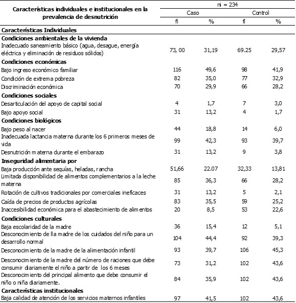 En cuanto a las características sociales hubo exposición al bajo apoyo social en 13,2% (31) de los casos y en 1,7% (4) de los controles. La desarticulación del apoyo del capital social tuvo poca influencia en ambos grupos de estudio. En las características biológicas, fue la inadecuada lactancia materna exclusiva durante los primeros 6 meses de vida del niño que recayó en 42,3% (99) de lo casos y en 39,7% (93) de los controles, seguido del bajo peso al nacer en 18,8% (44) de los casos y en 6,0% (14) de los controles. La desnutrición materna durante el embarazo es otra característica que afectó a 13,2% (31) de los casos y a 3,8% (9) de los controles.