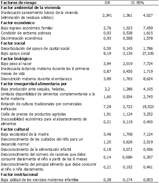 En la tabla 2 se analiza los chances de los factores de riesgo para desarrollar la desnutrición, donde se observó que el bajo apoyo social tuvo alrededor de nueve veces más de chanches para desarrollar la desnutrición infantil [OR = 9,19, IC = 3,130-27,030], la rotación de cultivos tradicionales por los comerciales ineficaces tuvo alrededor de siete veces más de chances para desarrollar la desnutrición [OR = 7,29, IC = 2,722-19,523], el bajo peso al nacer tuvo cerca a cuatro veces más de chances [OR = 3,94, IC = 2,019-7,724], la desnutrición materna durante el embarazo con cerca de cuatro veces más [OR = 3,89, IC = 1,763-8,624], la baja escolaridad de la madre con cerca de cuatro veces más [OR = 3,48, IC = 1,708-7,124], el bajo ingreso económico familiar con cerca a tres veces más [OR = 2,76, IC = 1,023-7,459], el inadecuado saneamiento básico de la vivienda (eliminación de residuos sólidos) alrededor de dos veces más [OR = 2,341, IC = 1,361- 4,027], y la baja producción ante sequías, heladas, alrededor de dos veces más de ventaja [OR = 2,2, IC = 1,286-4,105].