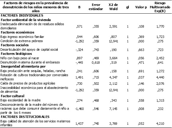 En el análisis de la asociación de los factores de riesgo a la desnutrición de los niños menores de tres años en estudio se observó existencia de relación significativa entre el factor: desconocimiento del número de raciones que debe consumir diariamente el niño a partir de los 6 meses [X2 = 30,213 y p = 0,00]; también, resultó con asociación importante la inaccesibilidad económica para el abastecimiento de alimentos, el bajo apoyo social, la rotación de cultivos agrícolas tradicionales por aquellos comerciales ineficaces, el desconocimiento del principal alimento que debe consumir el niño diariamente, el bajo peso al nacer, el desconocimiento de la madre de la alimentación infantil, la baja escolaridad de la madre, la desnutrición materna durante el embarazo, el inadecuado saneamiento básico de la vivienda (desague, eliminación de residuos sólidos, agua, y energía eléctrica), la baja producción ante sequías, heladas, ranchas [X2 = 26,022, X2 =21,893, X2 =19,679, X2 =17,680, X2 =17,394, X2 =15,565, X2 =12,650, X2 =12,438, X2 =9,622 y X2 =8,075 respectivamente; con P = 0,00 ], entre otros.