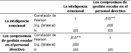 Interpretación: Como el valor p = 0.000 < 0.05, la inteligencia emocional se relaciona significativamente con los compromisos de gestión escolar en el personal directivo del nivel inicial, asimismo la correlación es significativa y alcanza un nivel de 0.815 que corresponde a un nivel correlación positiva alta.