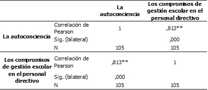 Interpretación: Como el Valor p = 0.000 < 0.05, se rechaza la Hipótesis Nula y se acepta la Hipótesis Alterna. Por lo tanto, la autoconciencia y la variable los compromisos de gestión escolar en el personal directivo del nivel inicial, asimismo la correlación es significativa y alcanza un nivel de 0.813 que corresponde a un nivel correlación positiva alta.