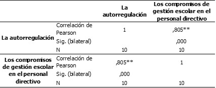 Interpretación: Como el Valor p = 0.000 < 0.05, la autorregulación se relaciona de manera significativa con los compromisos de gestión escolar en el personal directivo del nivel inicial, Red 1, UGEL Ventanilla Callao, asimismo la correlación es significativa y alcanza un nivel de 0.805 que corresponde a un nivel correlación positiva alta.