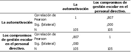 Interpretación: Como el Valor p = 0.000 > 0.05, la automotivación se relaciona significativamente con los compromisos de gestión escolar en el personal directivo del nivel inicial, asimismo la correlación es significativa y alcanza un nivel de 0.807 que corresponde a un nivel correlación positiva alta.