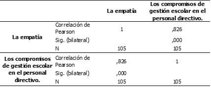 Interpretación: Como el Valor p = 0.000 > 0.05, se rechaza la Hipótesis Nula y se acepta la Hipótesis Alterna. Por lo tanto, la empatía se relaciona con los compromisos de gestión escolar en el personal directivo del nivel inicial, asimismo la correlación es significativa y alcanza un nivel de 0.826 que corresponde a un nivel correlación positiva alta.