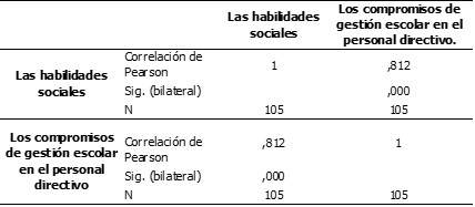 Interpretación: Como el Valor p = 0.000 > 0.05, se rechaza la Hipótesis Nula y se acepta la Hipótesis Alterna. Por lo tanto, las habilidades sociales se relacionan con los compromisos de gestión escolar en el personal directivo del Nivel Inicial, asimismo la correlación es significativa y alcanza un nivel de 0.812 que corresponde a un nivel correlación positiva alta.