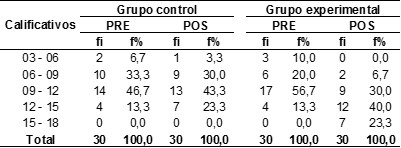 Para el caso de los resultados en el grupo control, podemos notar que en la preprueba el 46,7 % (14) estudiantes obtienen calificativos igual o mayor a 09, pero menor a 12; mientras que en la posprueba el 43,3 % (13) obtienen calificativos en ese mismo intervalo, demostrándose que no existe diferencia sustancial entre los resultados de ambas pruebas.