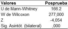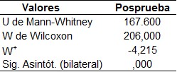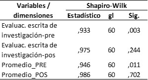 En la tabla 1 observamos que, si bien es cierto que en algunas dimensiones el valor de la sig. (?) > 0,05, el hecho que para la dimensión lectura de investigación en la preprueba el valor de la sig. (?) < 0,05, convierte a todos los datos en una distribución que no configura la curva normal, por lo tanto corresponde utilizar estadígrafos no paramétricos, y al ser las variables del tipo ordinal y el objetivo investigativo es medir influencia, se eligió a los Rangos de Wilcoxon, para el caso de muestras relacionadas y la U de Mann Whitney para muestras independientes.