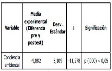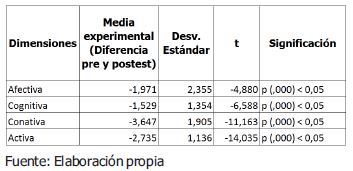 Los resultados de las hipótesis específicas, relacionados con las dimensiones afectiva, cognitiva, conativa y activa en la Tabla 2. Las muestras relacionadas, de la diferencia de pre y postest.