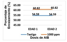 La aplicación de la auxina AIB de 1 000 ppm en brotes de edad 2 generaron enraizamientos categorizados como muy altos.
