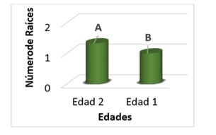 La prueba de Tukey, evidenció la diferencia estadística significativa del número de raíces registrado por los brotes de dos diferentes edades. Se reportó un mayor número de raíces (1.33), en brotes con edades entre 65 - 74 días (edad 2) Los brotes con edades entre 55 ? 64 días (edad 1) presentaron en promedio (1) raíces (Gráfico 01).