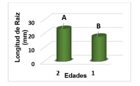 El gráfico 02 muestra la diferencia estadística significativa para longitud de raíces de los brotes a dos diferentes edades. La prueba de Tukey evidenció que el rango de edad 2 (65 a 74 días) presentó las mayores longitudes de raíces (23.36 mm.), mientras que el rango de edad 1 (55 a 64 días) muestra valores más bajos (17.78 mm).