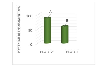 La prueba de Tukey indicó que el mayor porcentaje de enraizamiento se dio en brotes de la edad 2, alcanzando el 88%, en tanto que los brotes de edad 1 solo enraizaron en un 59%, estos porcentajes de enraizamiento son considerados como muy alto y medio respectivamente según la escala DEL RÍO Y CABALLERO (2005).