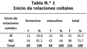 En relación al inicio de relaciones sexuales se muestra en la Tabla N.° 1, donde el porcentaje de adolescentes que iniciaron relaciones coitales es el 26,3% y el 73,7% aún no lo han iniciado; así mismo, se pudo observar la frecuencia en cuanto a sexo, siendo en mujeres el 18,8% y en varones el 34,4%.