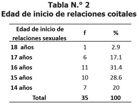 En la tabla N.° 2, sobre las edades de inicio de relaciones coitales, se observó que los adolescentes las iniciaron con una edad mínima de 14 años y una máxima de 18 años, donde el 20% las inició a los 14 años, el 28,6% a los 15 años, el 31,4% a los 16 años, el 17,1% a los 17 años y el 2,9% a los 18 años.