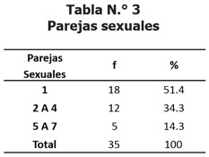 En la Tabla N.° 3 se determinó el número de parejas sexuales, hasta la actualidad, que tuvieron los adolescentes del estudio; donde el 51,4% indicó que tuvo una sola pareja sexual hasta el momento; el 34,3%, de 2 a 4 parejas sexuales y el 14,3%, de 5 a 7 parejas sexuales.