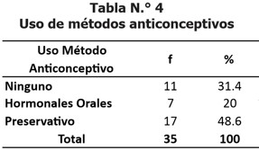 En la Tabla N.° 4 se determinó el uso de métodos anticonceptivos por parte de los adolescentes que iniciaron relaciones coitales, donde el 31,4% indicó que no usa ningún método anticonceptivo, el 20% usa los anticonceptivos hormonales orales indicando que se considera dentro de ella la pastilla del día siguiente, y el 48,6% usa el preservativo.