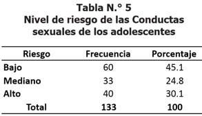 En la Tabla N.° 5 se determinó el nivel de riesgo sobre las conductas sexuales que poseen los adolescentes, encontrando que el 45% posee un riesgo bajo; el 33%, mediano riesgo y el 30%, alto riesgo.