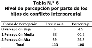 En la Tabla N.° 6 se determinó que la percepción del conflicto interparental en los adolescentes indico que el 4,5% tiene una baja percepción de los conflictos interparentales, el 66,2% presentó una percepción media y el 29,3% una percepción alta.