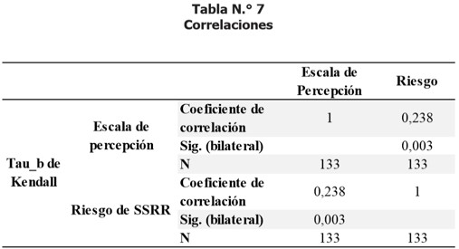 Al realizar el análisis inferencial de la correlación entre la percepción de conflicto interparental por parte de los hijos y las conductas de riesgo de la salud sexual y reproductiva de los adolescentes, se determinó con un valor de ?Tau b? de Kendall de 0,238 y un valor de p=0,003 que siendo menor al valor de significancia de 0,05 permitió rechazar la hipótesis nula y aceptar la hipótesis de estudio, donde existe una correlación significativa baja entre las variables de estudio, como se puede apreciar en la Tabla N.° 7.