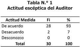 De los 30 auditores encuestados respondieron 28 auditores, que sí deben tener una actitud escéptica al planificar y desarrollar una auditoría. Esta respuesta representa el 98% de los encuestados. Se utilizó el método de análisis formal y el de confrontación empírica, con lenguaje matemático, considerados como método de contrastación y de hallazgo. De la misma manera se utilizó la estadística descriptiva e inferencial, chi-cuadrado, para la contrastación de la hipótesis alterna, obteniendo el siguiente resultado: chi-cuadrado 33.52 mayor que la Tabla cuyo valor es de 15.507, con grado de libertad de 8, con nivel de significancia de 0.05; llegando a la conclusión: El escepticismo aplicado adecuadamente mejora la auditoría financiera.