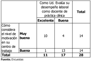 Tabla de contingencia. Cómo considera el nivel de motivación en su centro de trabajo. C6oacutemo usted evalúa su desempeño laboral como docente de práctica clínica.