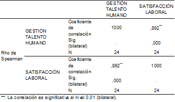 Interpretación: En la tabla 1 se muestra que la R de Spearman es mayor a 0.5, señalando que existe relación significativa entre la variable gestión del talento humano y satisfacción laboral; en este sentido, se afirma la primera hipótesis general, la cual manifiesta que ambas variables se relacionan entre sí con una fuerte correlación.