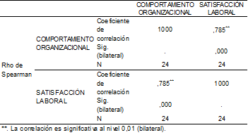 Interpretación: En la tabla 2, se muestra que la R de Spearman es mayor a 0.5, indicando que existe relación significativa entre la dimensión de comportamiento organizacional y la satisfacción laboral; en este sentido, se confirma la primera hipótesis específica, la cual manifiesta que el comportamiento organizacional se relaciona en la satisfacción laboral con una correlación buena de 0.875.