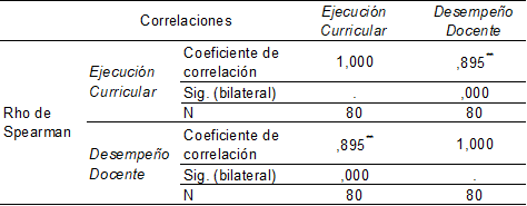Tabla 1 - Prueba de la Correlación de Spearman de la Ejecución Curricular y el desempeño del docente