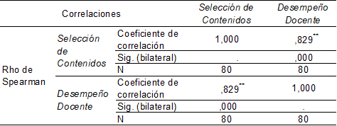Segunda Existe una relación significativa entre la selección de contenidos a enseñar y el Desempeño docente, según los estudiantes de formación profesional universitaria (r=0,829 y p=0,000); es decir, a mejor elección de contenidos a enseñar, mejor Desempeño docente.