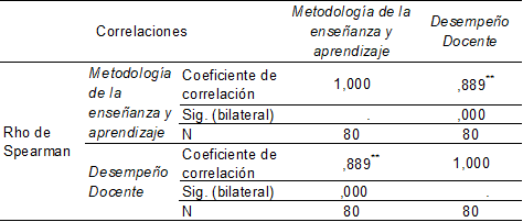 Existe una relación significativa entre la metodología de la enseñanza y aprendizaje en una sesión de clase y el Desempeño docente según los estudiantes de formación profesional universitaria. (r=0,889 y p=0,000); es decir, a mejor metodología de la enseñanza y aprendizaje en una sesión de clase mejor Desempeño docente. Martínez (2017) sostiene que hay deficiencias en el plan curricular y en el Perfil del egresado. Faria (2016) da cuenta que los factores de Desempeño docente y métodos didácticos influyen positivamente en el rendimiento académico de los estudiantes, además, el factor de influencia conjunta del Desempeño docente y métodos didácticos no tienen participación significativa en el rendimiento académico de los estudiantes. León (2016) sostiene que el factor experiencia y preparación sobre la teoría y técnica de investigación de los docentes asesores es un aspecto muy importante en la culminación de los proyectos de investigación debido a que es un factor facilitador y motivador para los estudiantes. Navarro (2010) manifiesta que con el empleo de estrategias pedagógicas y académicas orientará a la formación progresiva del nuevo capital humano integral que requiere el país.